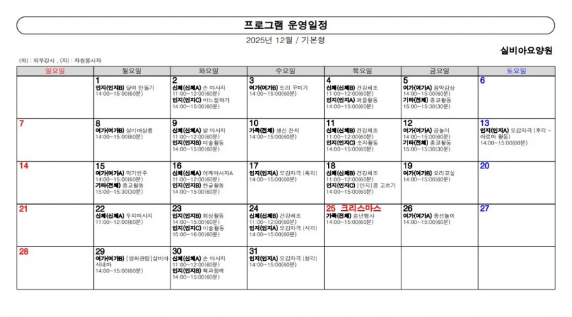 2025년 12월 식단표 페이지 정보 작성자 실비아요양원 댓글 댓글 0건 조회Hit 4회 작성일Date 25-12-07 16:41 본문 실비아요양원 2025년 12월 프로그램 일정표입니다. 요양원의 사정으로 일정은 변경될 수 있습니다. 목록 답변 다음글2025년 11월 프로그램 일정표 25.11.08 댓글 0 댓글목록 등록된 댓글이 없습니다.