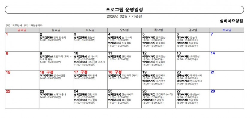 2026년 2월 프로그램 일정표 페이지 정보 작성자 실비아요양원 댓글 댓글 0건 조회Hit 7회 작성일Date 26-02-02 10:33 본문 실비아요양원 2026년 2월 프로그램 일정표입니다. 요양원의 사정으로 일정은 변경될 수 있습니다. 목록 답변 다음글2026년 1월 프로그램 일정표 26.02.02 댓글 0 댓글목록 등록된 댓글이 없습니다.